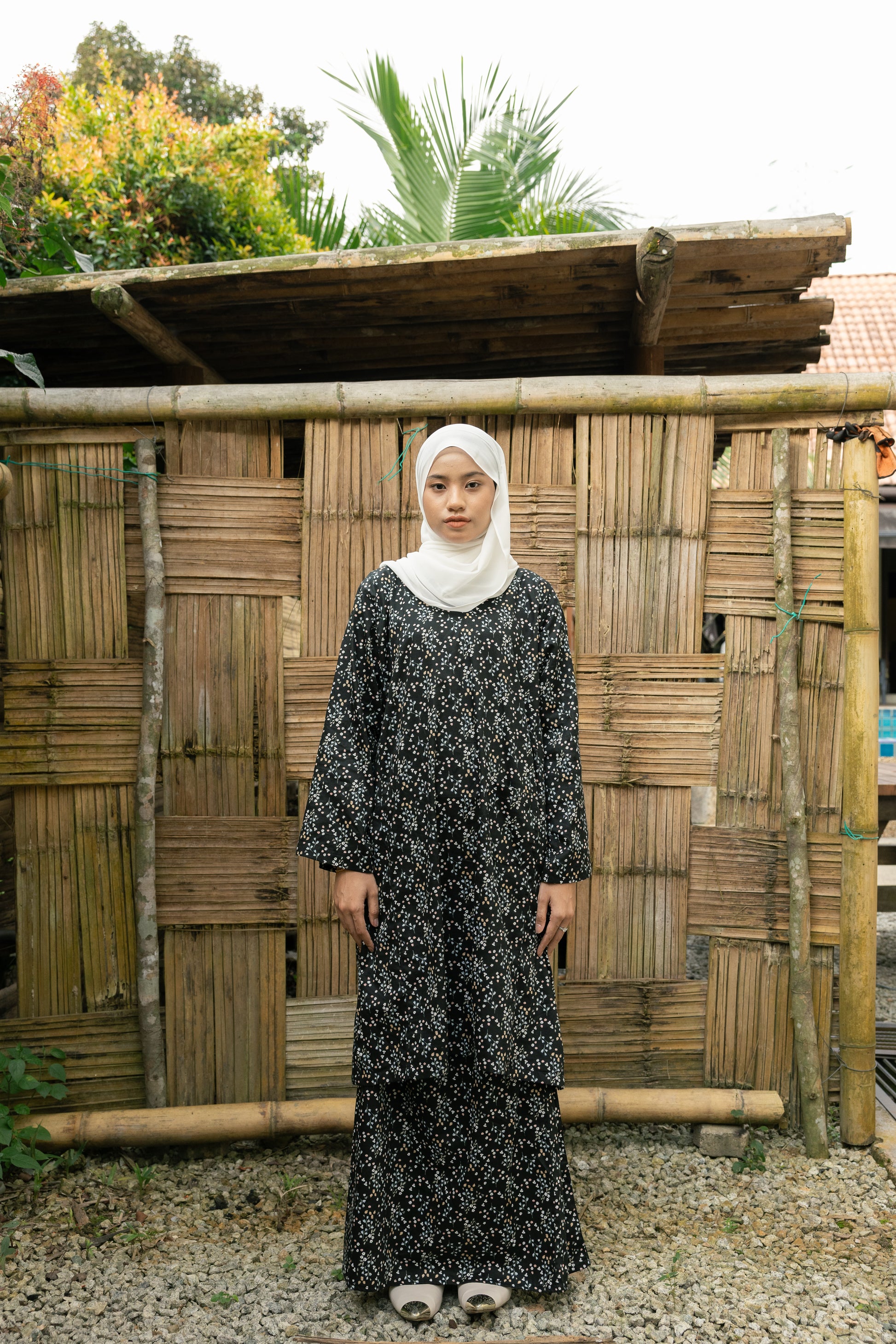 Our Baju Kurung Floral Perempuan, made from cotton with floral prints, features a design and cut inspired by the 1950s and 60s. It includes traditional elements such as a baju with pesak and kekek that falls below the knees, a loose and comfortable fit, the kocek tampal in the front, a kain-skirt with the iconic ombak mengalun pleats, and the timeless Teluk Belanga collar. This piece pays homage to the classic Baju Kurung worn by the women before us, while utilising a versatile and presentable fabric suitable for everyday wear and all occasions.
