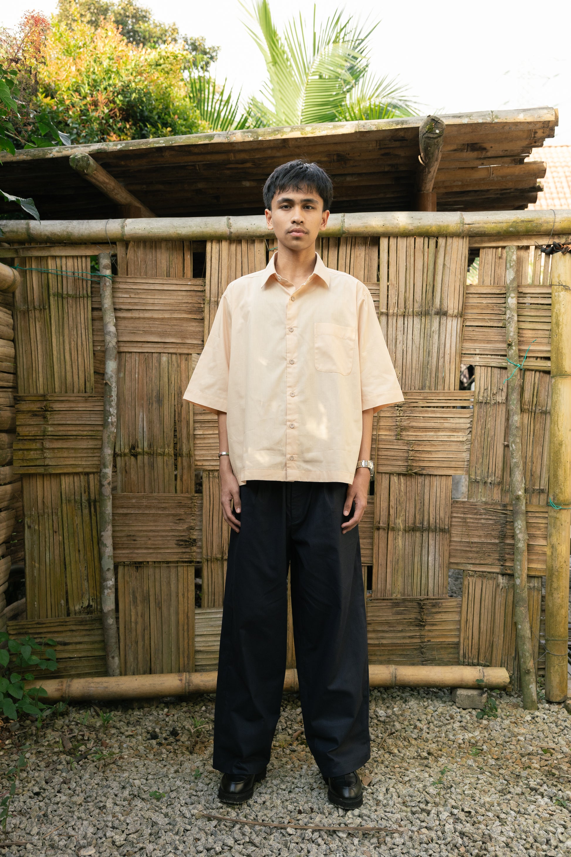 Our vintage-style men’s wear features a short-sleeved Kemeja and cotton Trousers, inspired by the daily, work, and smart-casual attire worn by men in the early to mid-20th century. The Kemeja has elbow-length sleeves, a relaxed and roomy fit, and a shorter length that falls at the hips without draping too low. The Trousers come with belt loops and a clean, versatile and baggy straight cut. Available in three colours, both pieces can be worn together as a matching set or styled separately with other items in your wardrobe to create fresh, unique looks.